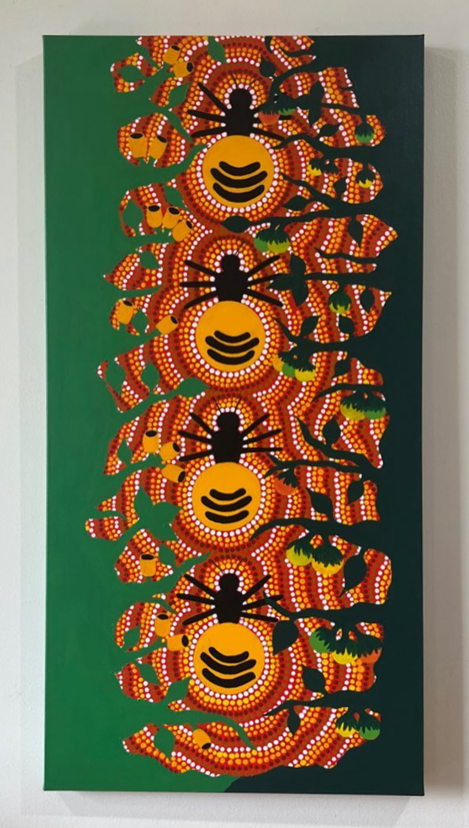 Bushtucker is about reconnecting with mother natures blessings and looking back on our ancestors ways. In this generation we are all so quick to buy products and items that impact us and our country, but long ago Aboriginal people survived off of nothing but the land and they and the land remained healthy. The land provides food, medicine and more! Here I added three things nature gives us for free, the gum tree plant which is to symbolise the earths medicines since eucalyptus plants can be used to treat unhappy stomachs. Bush tomato’s since they’re a well known food and honey ants because they are a delicacy and from my ancestors country, desert country. - Shipping prices to be determined.