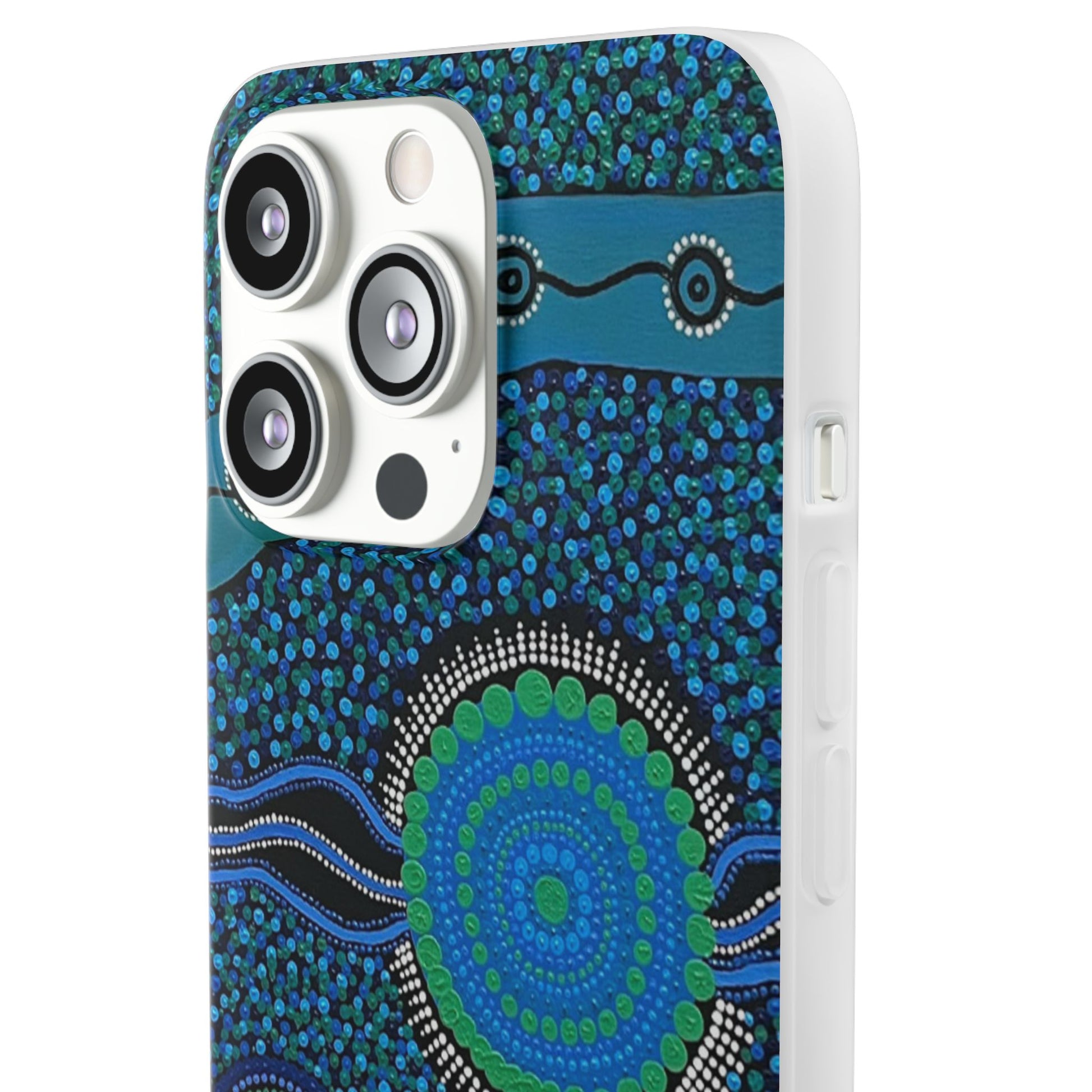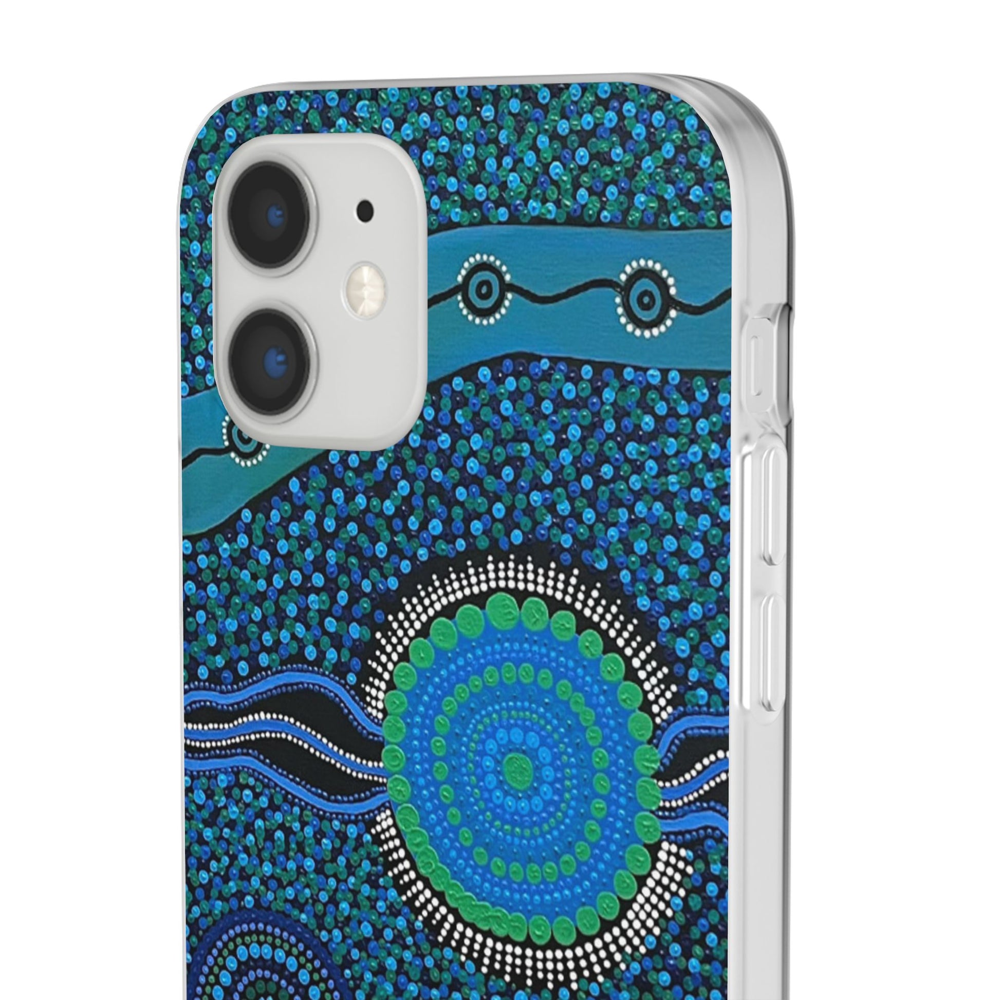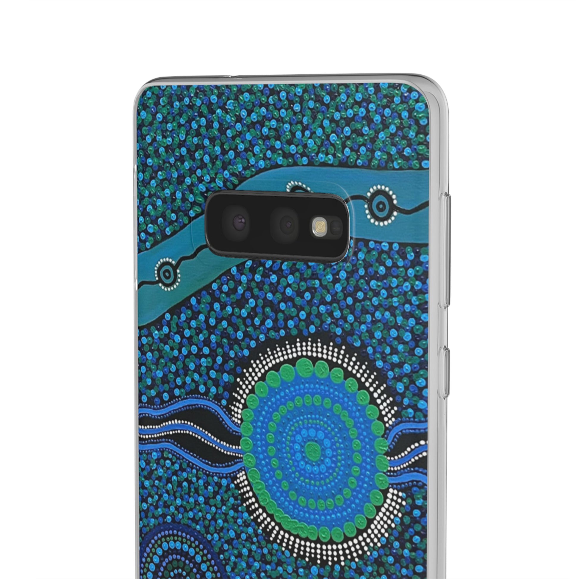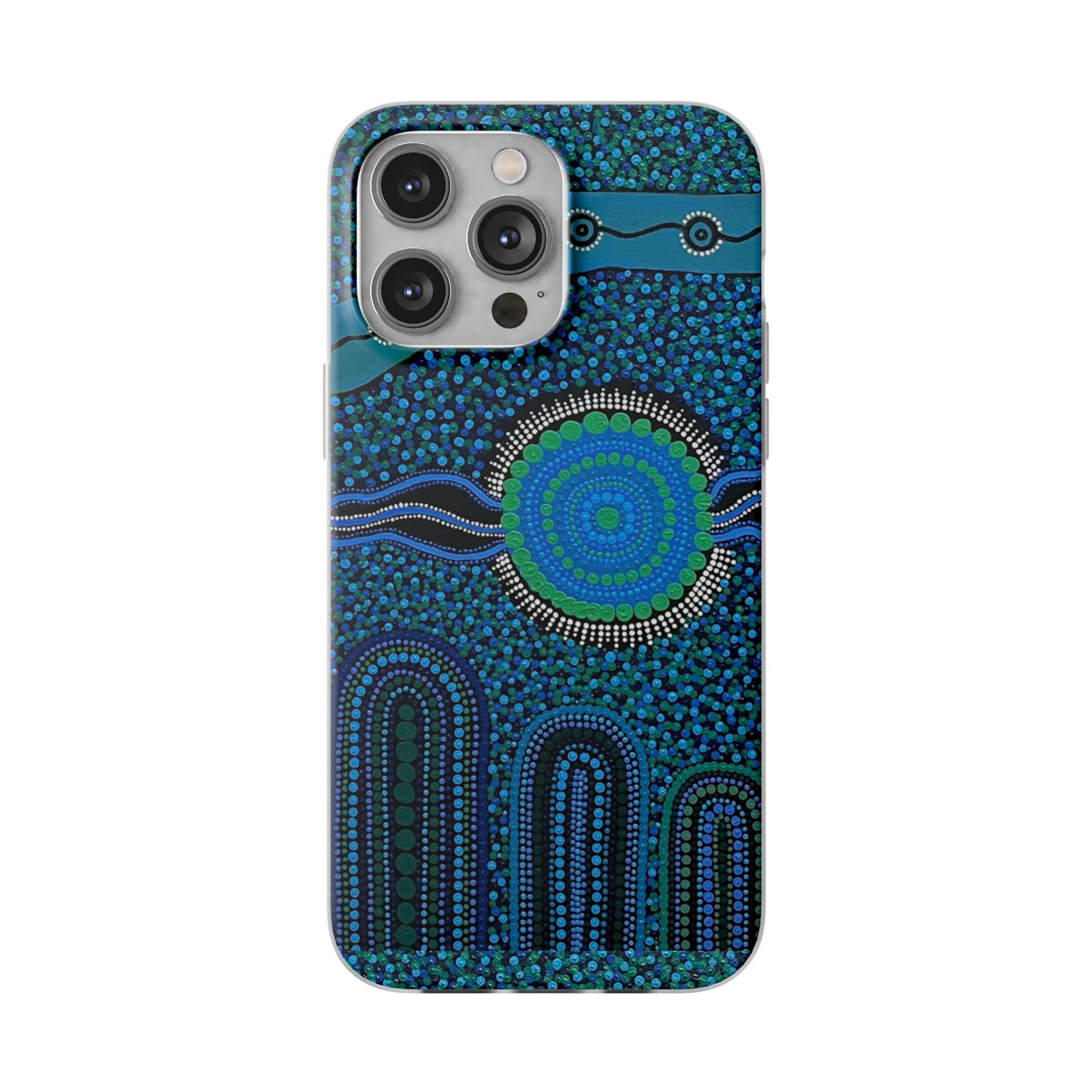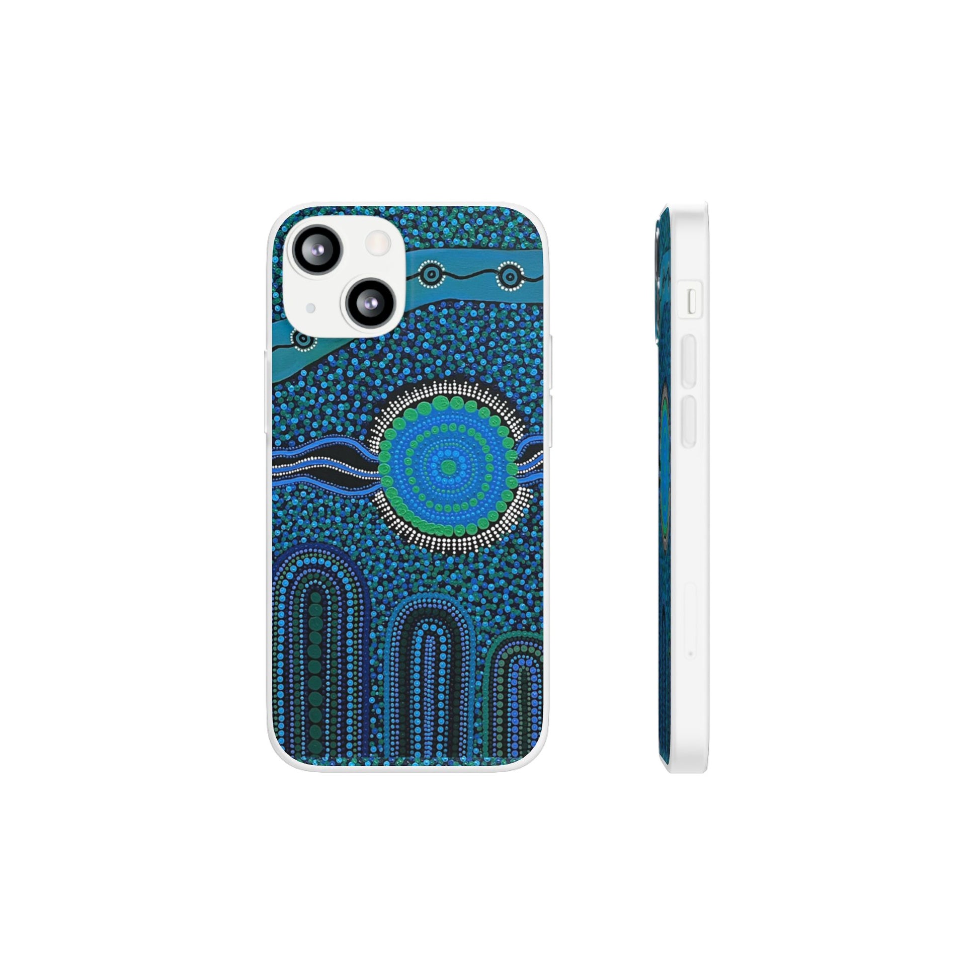 The greens and blues are to capture two different waterways, salt water and fresh water. The two contrasted symbols are also to represent that. This piece was inspired by the trips my family and I have gone on to waterholes and other aquatic environments, the people representing us and bonding with the land and others.