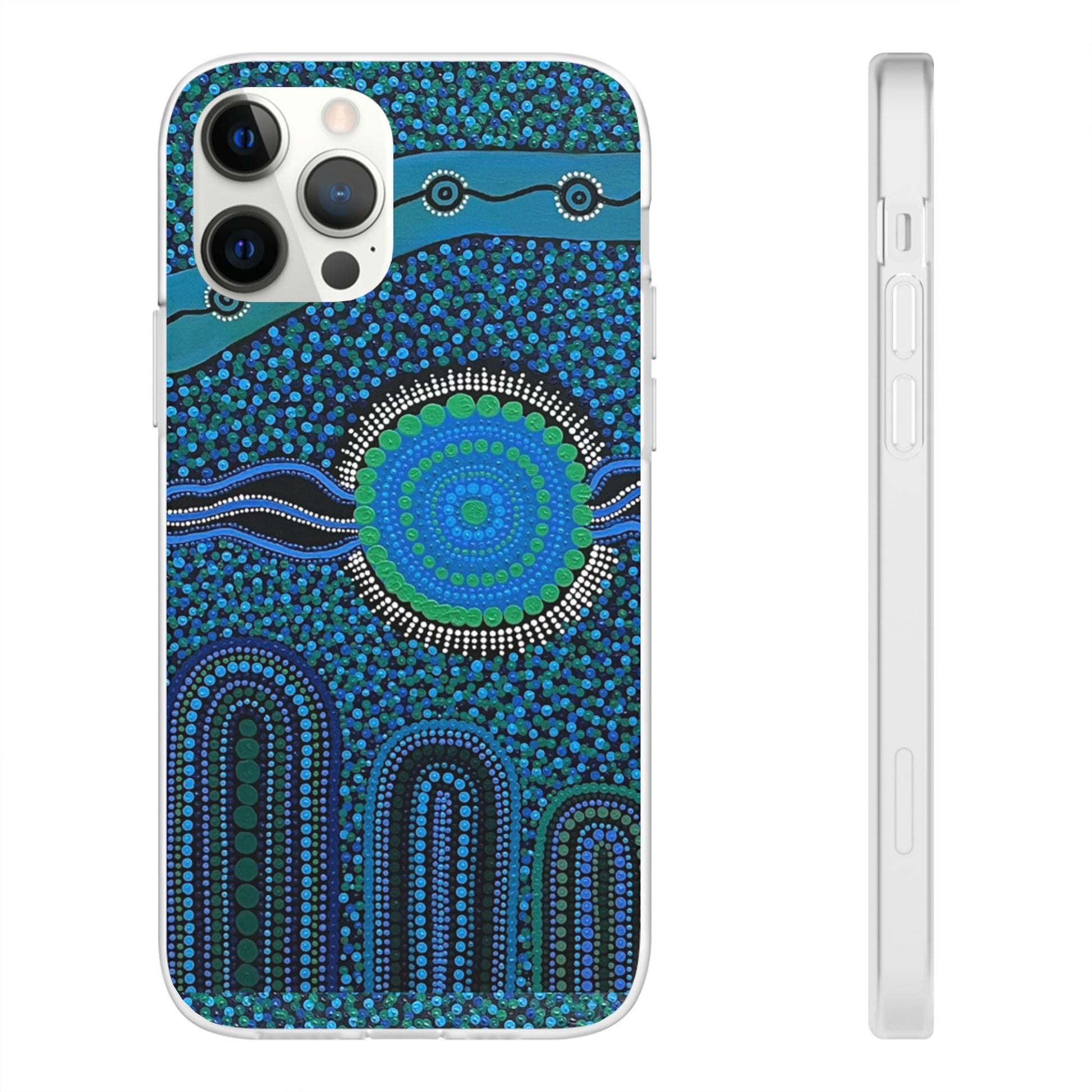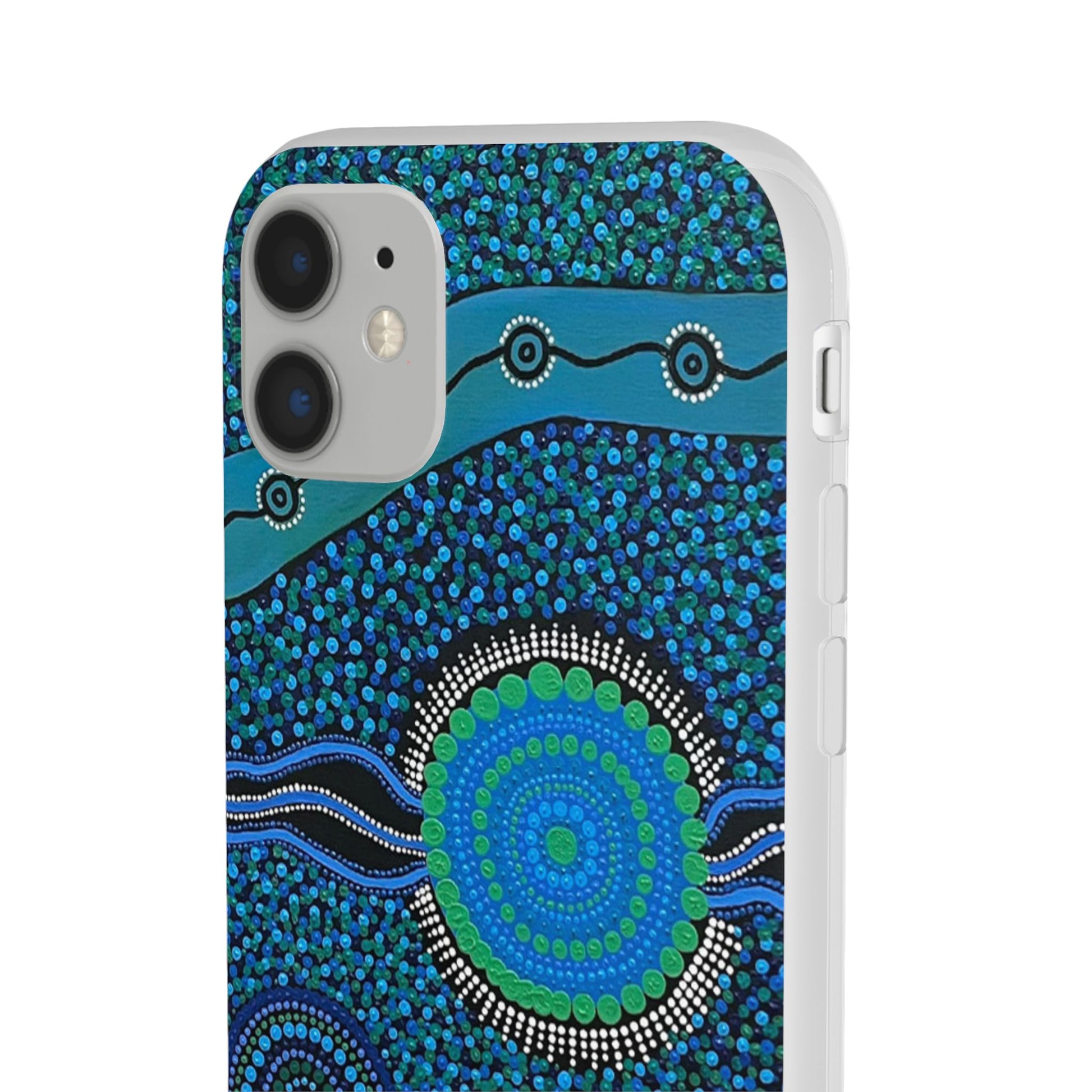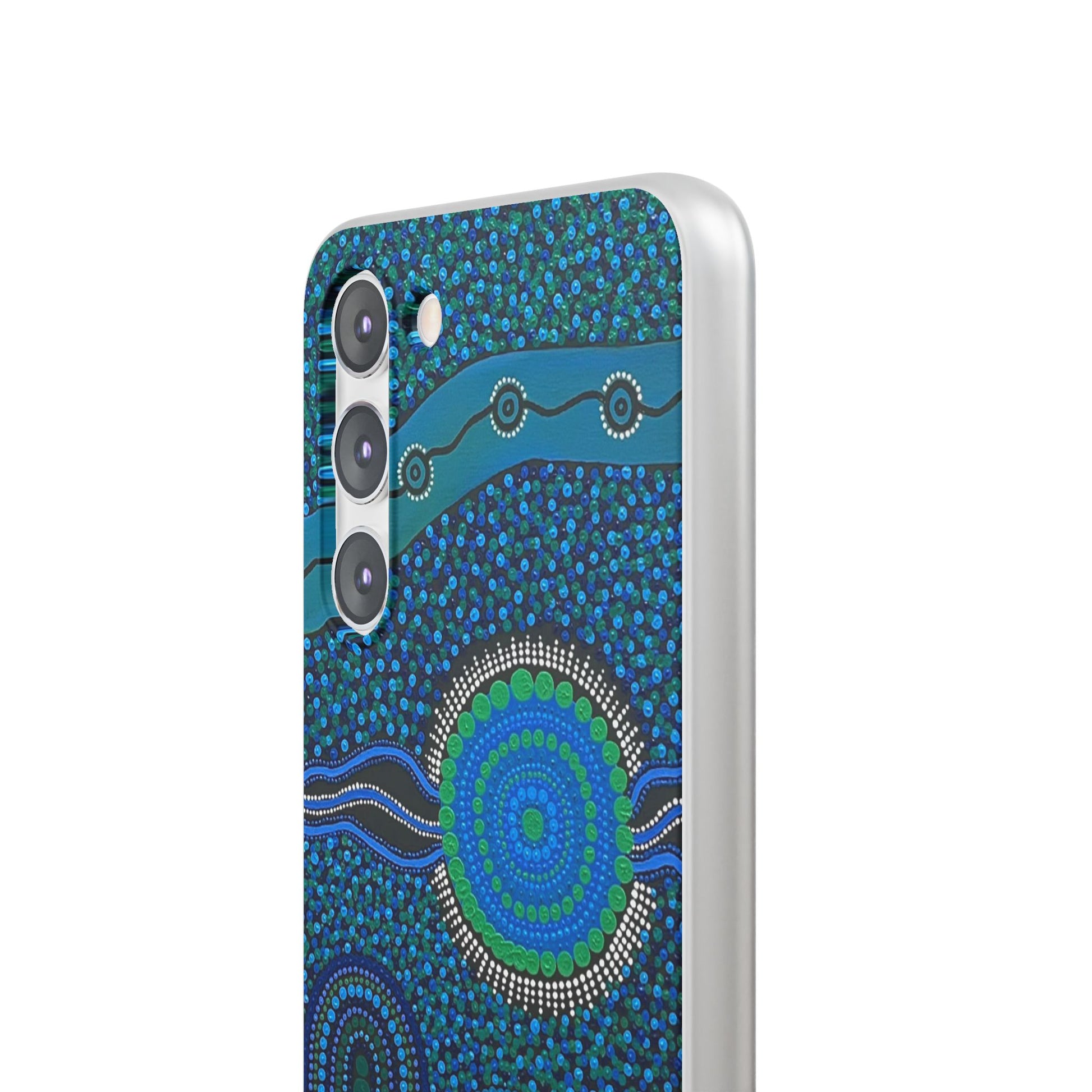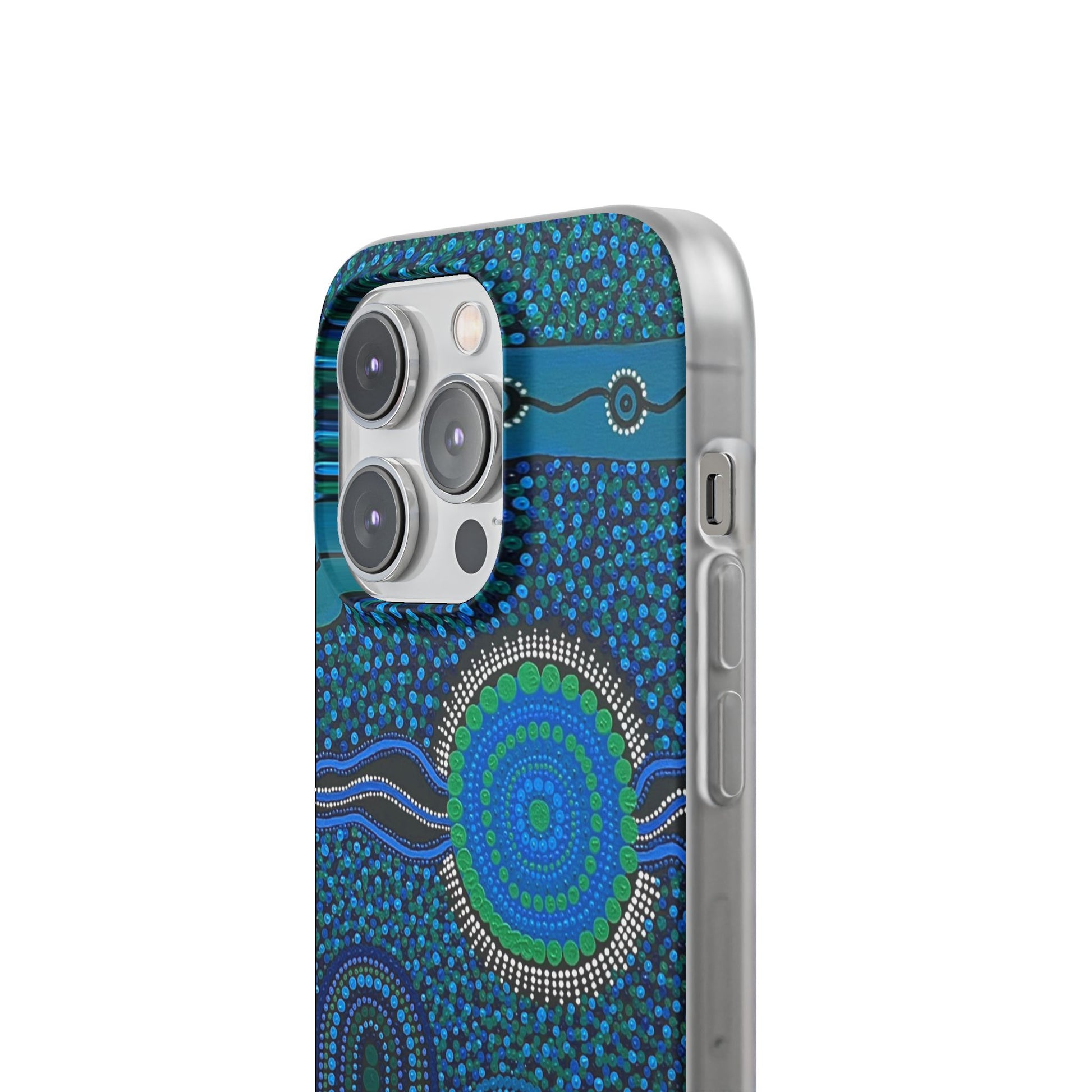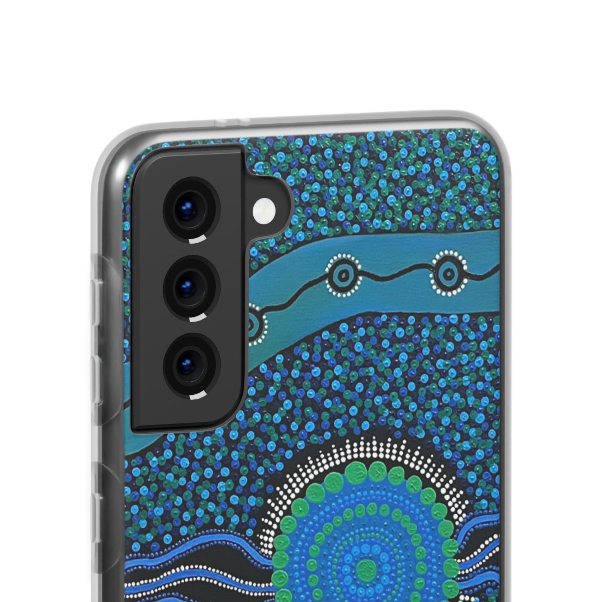 The greens and blues are to capture two different waterways, salt water and fresh water. The two contrasted symbols are also to represent that. This piece was inspired by the trips my family and I have gone on to waterholes and other aquatic environments, the people representing us and bonding with the land and others.