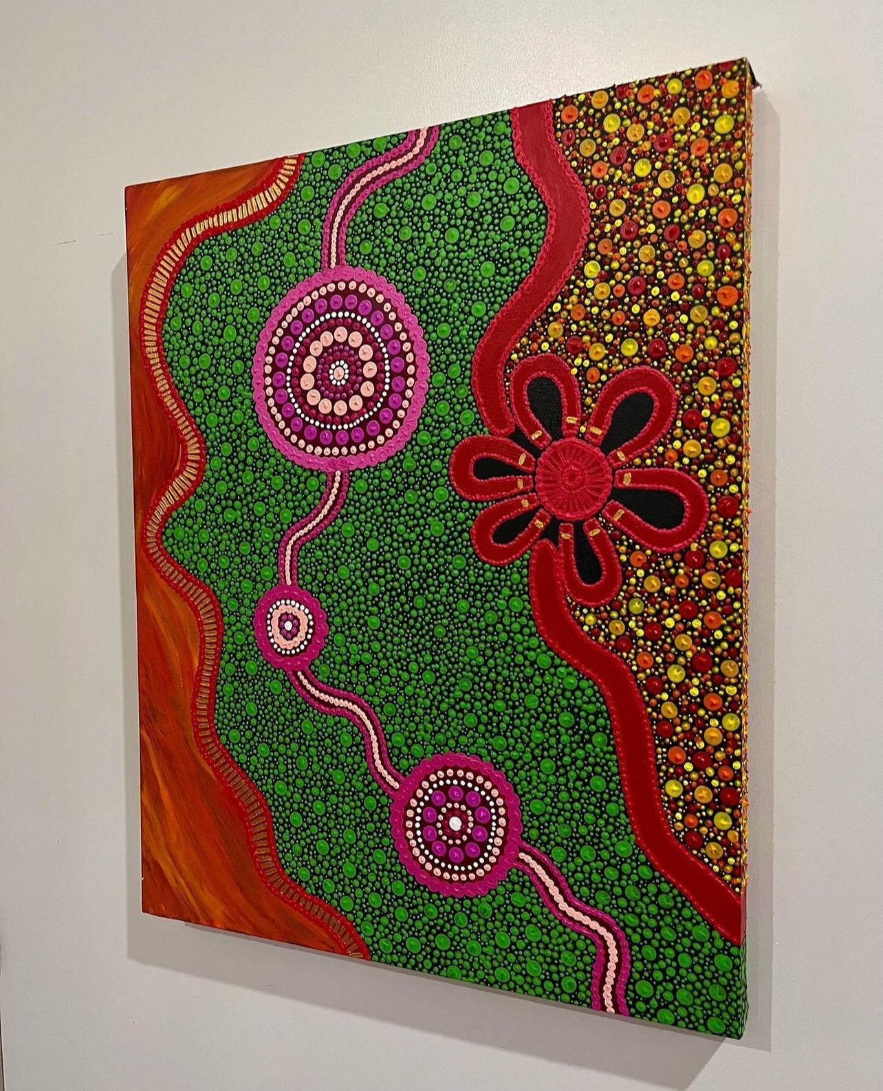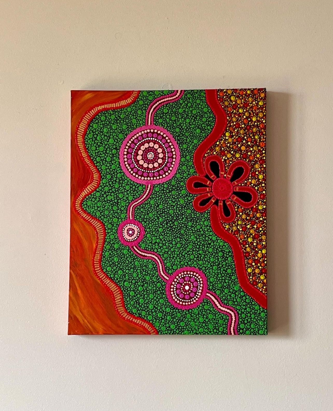This painting represents the beauty in burn offs used over time by Aboriginal people. Burn offs and controlled fires was a common practice to help clear pathways, hunt and replenish vegetation. As the time would come for our ancestors to meet back with the land the flames would have turned into regrowth and life.