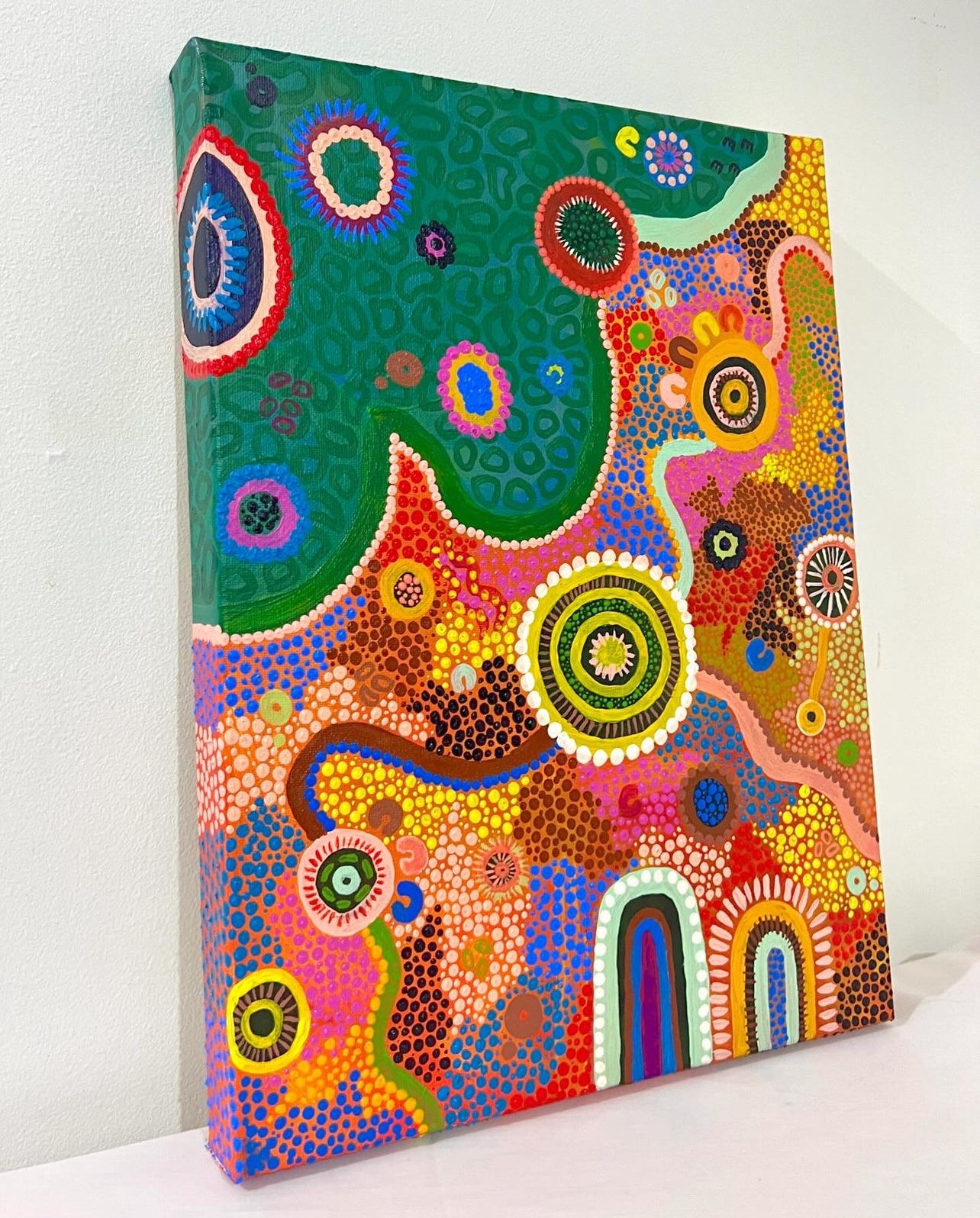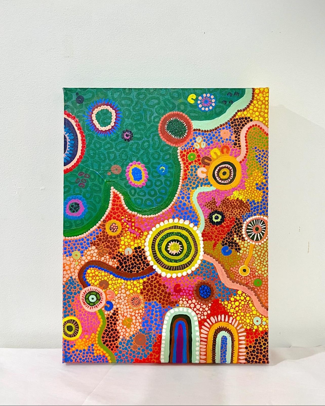'The little things' was inspired by my point of view of the NT, as this is where I was born and raised. The sunsets, bush, water ways and animals here bring me joy, because of this I decided to use bright colors to express just that. This piece reminds us all to take a second to enjoy the little things.